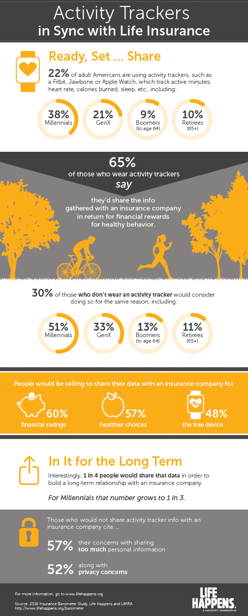 With 1 in 5 adults using activity trackers, we were interested to see who was up for getting rewarded for their good fitness behavior. This infographic breaks down who would share their activity tracker information for better life insurance rates and other benefits.